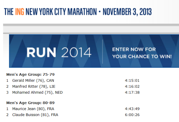 – le 3 Novembre, le Marathon de New-York où je termine à la 47353ème place mais 2e de sa catégorie d’âge – V5 – en 6h 00′ 26